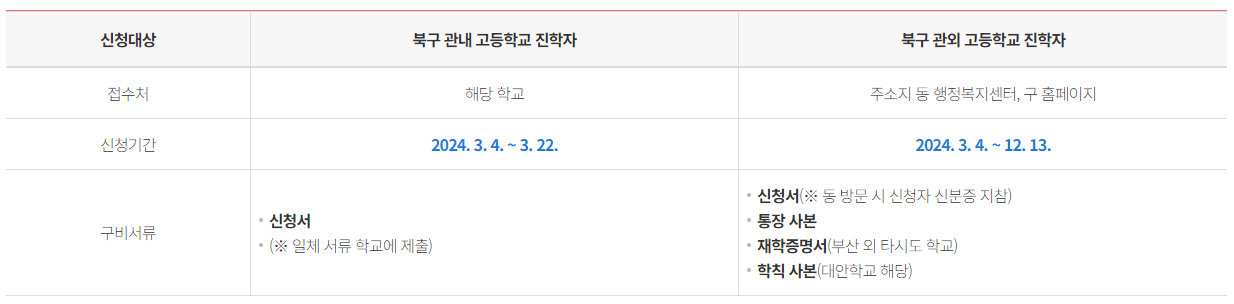 부산 북구 교복지원금 지원 대상은 2024. 3. 1. 현재 북구 주민등록자로, 교복을 입는 고등학교 및 타 시·도 소재 중학교에 입학하는 학생(학교 이외의 대안교육기관 포함)입니다.